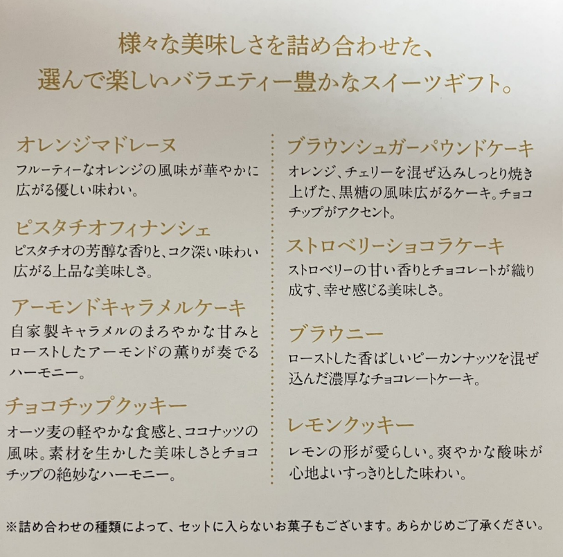 詳しいお菓子の内容です。好きなものばかりでした。どれも美味しそう!