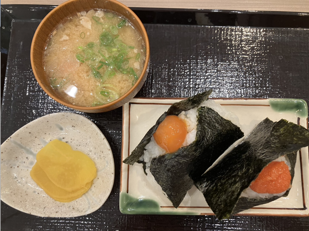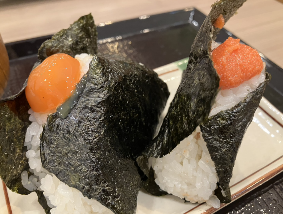 卵黄醤油漬け(左)と辛子明太子(右)にしました。おにぎりの中もしっかり具材が入っていました。