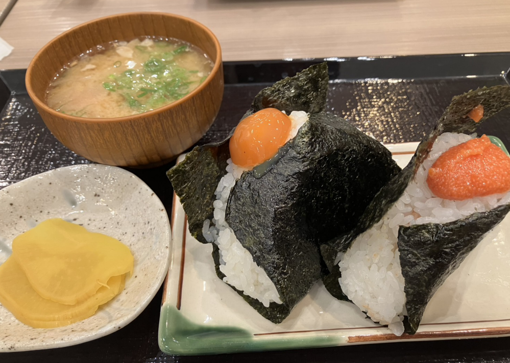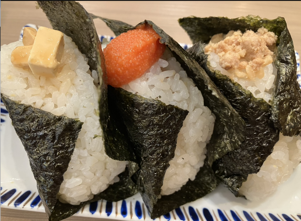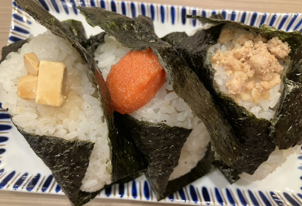 夫は、単品でおにぎり3つを注文しました。鶏そぼろ(右)、辛子明太子(真ん中)、クリームチーズの醤油漬け(左)です。