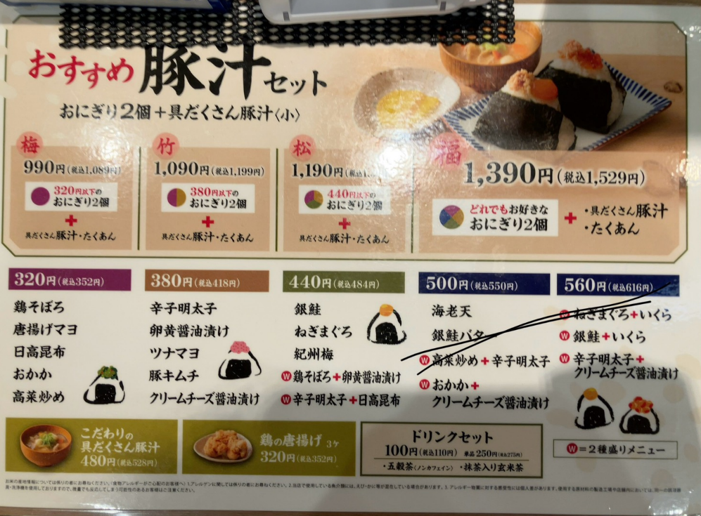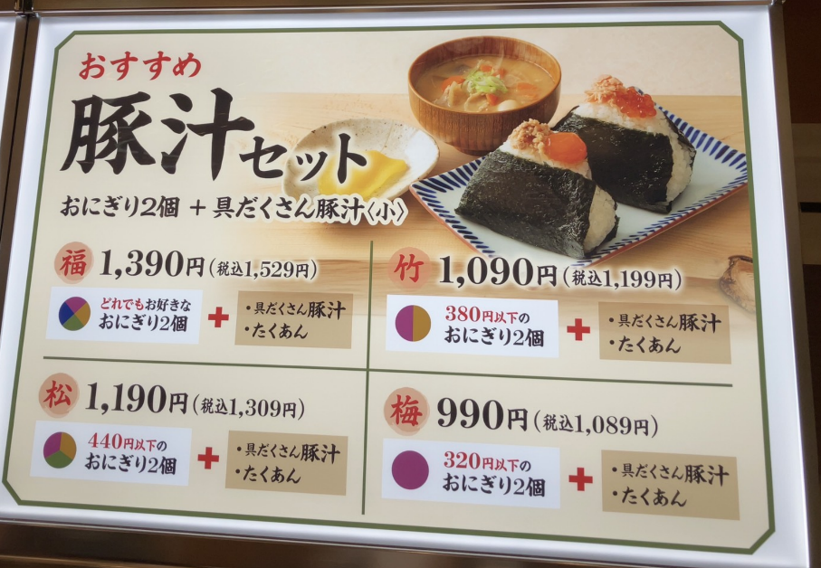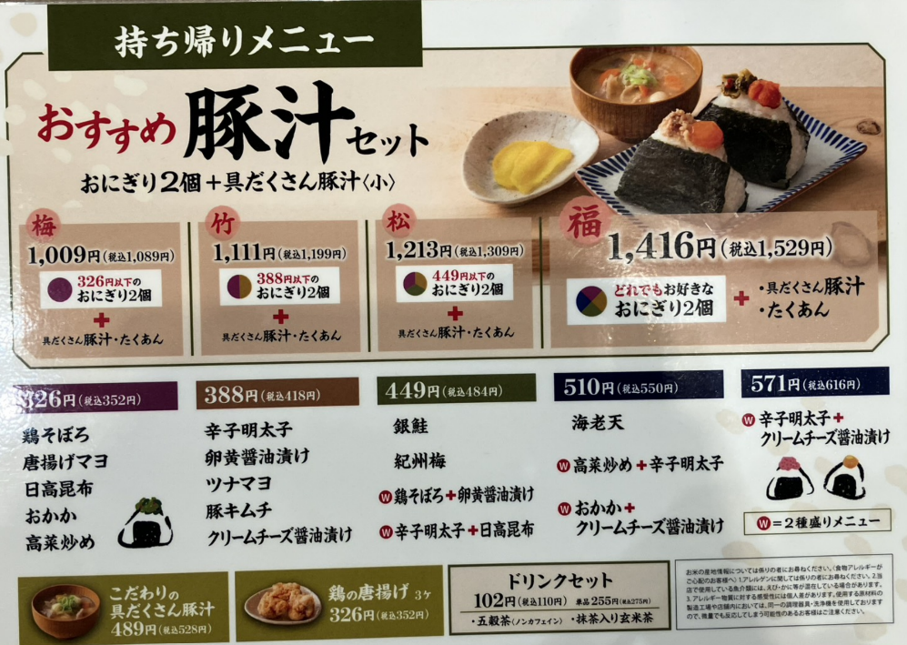 私は、竹セットにしました(税込1,199円)。豚汁+たくあん+380円以下のおにぎり2つです。