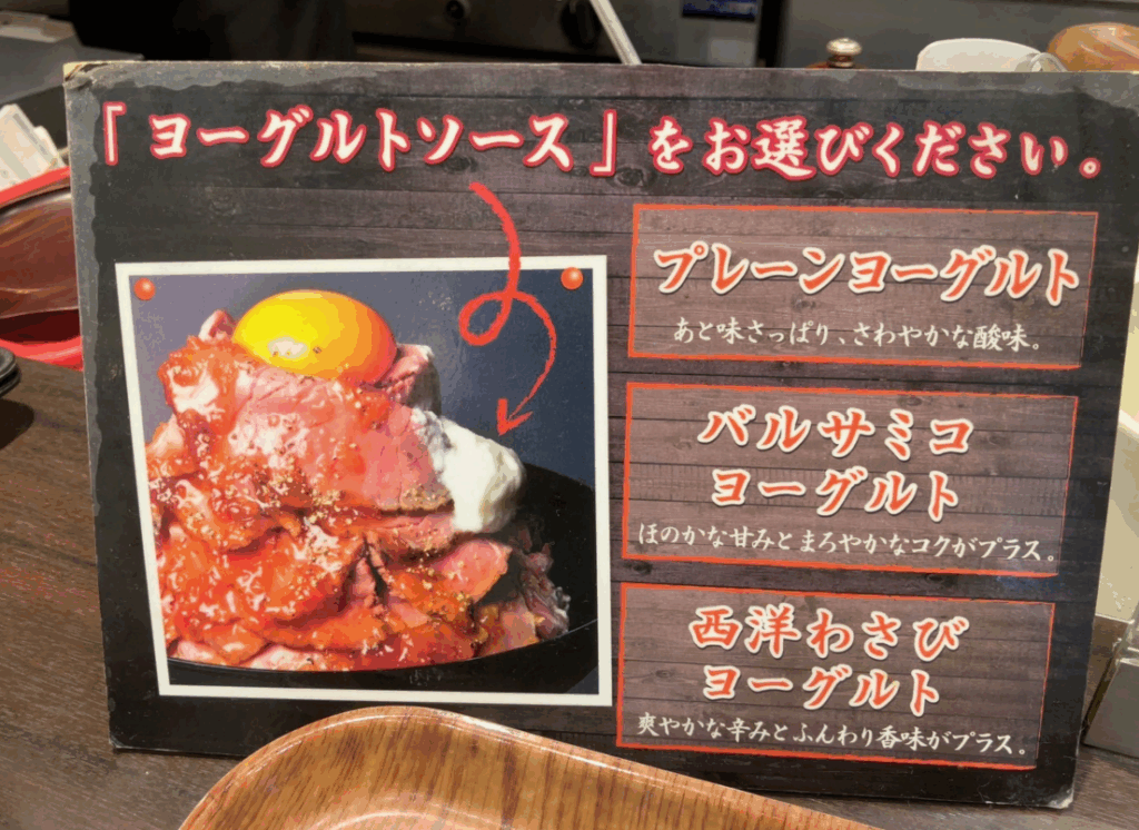 ローストビーフ丼はお肉の量、トッピング、ヨーグルトソースが選べます。(プレーンヨーグルト・バルサミコ・西洋わさび)