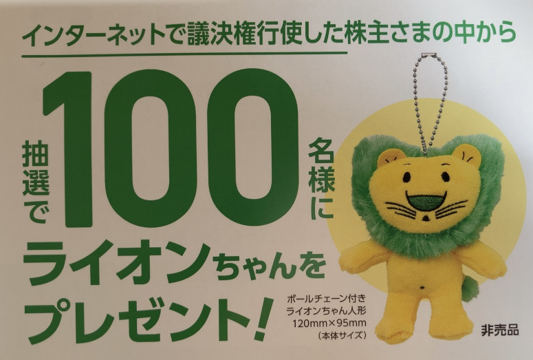 1つ目は、議決権行使した株主から抽選でライオンちゃんのプレゼント!です。