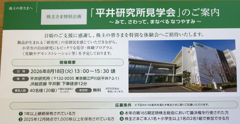 おまけ:見学会案内と議決権行使でライオンちゃん抽選あり