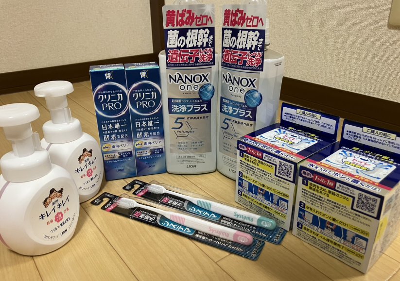 ハミガキ、ハブラシ、ハンドソープ、洗濯用洗剤、トイレ用消臭剤が入っていました( ^)o(^ )