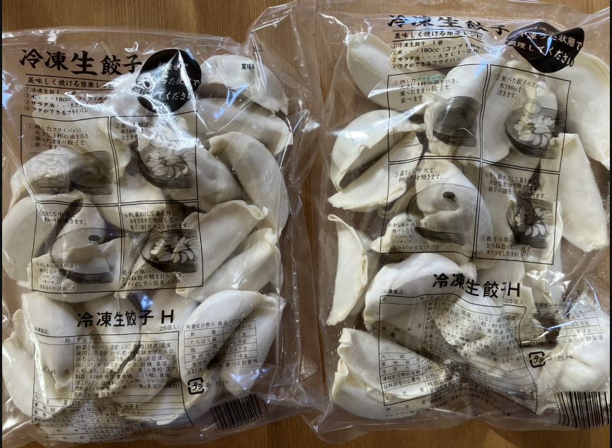 丸源冷凍生餃子50個(25個×2袋)。美味しいし助かります。