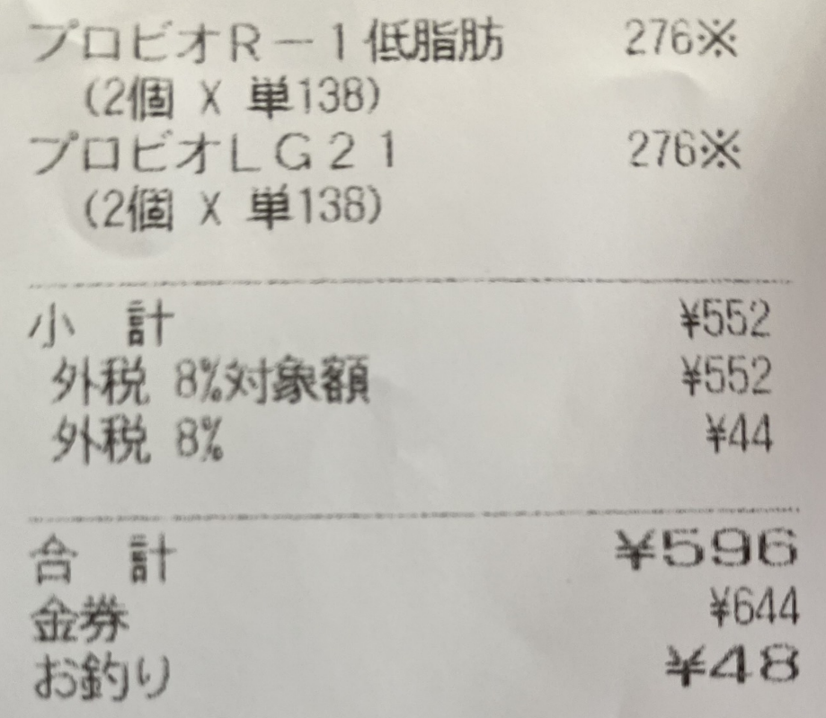 本当は〇%や半額などの割引品や全部異なる種類のヨーグルトを狙ってたのですが、品ぞろえの加減でこの2種類になりました。ギフト券は644円分でした。